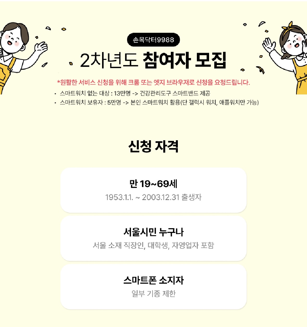 2022년도에 서울형 헬스케어로 1차 진행한 손목닥터 9988이 2023년도 2차 서울형 헬스케어 사업으로 참여자를 모집합니다.