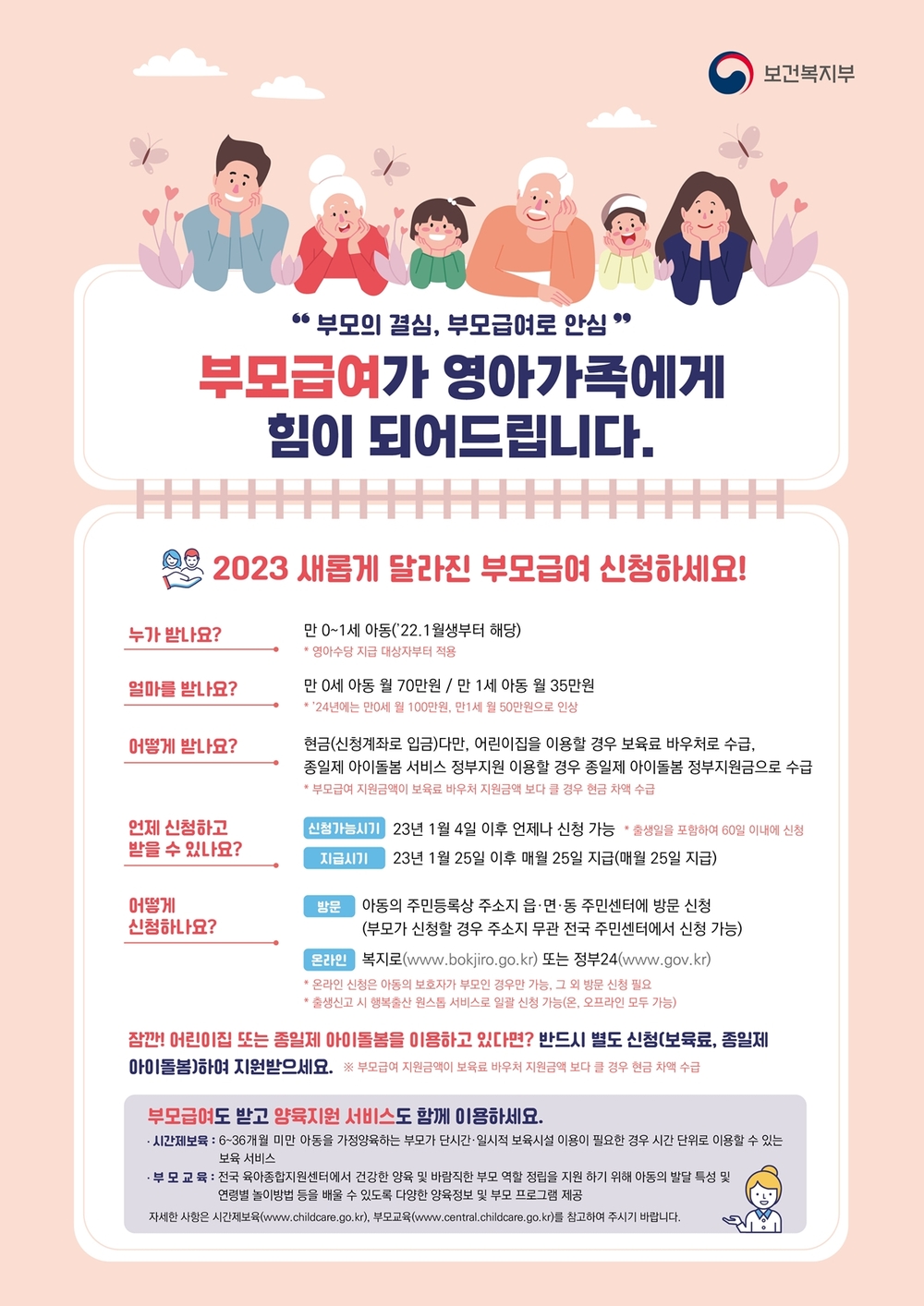 2023년 1월부터 돌봄이 집중적으로 필요한 영아를 가정에서 맘 편히 돌볼 수 있도록 부모급여를 지원합니다.